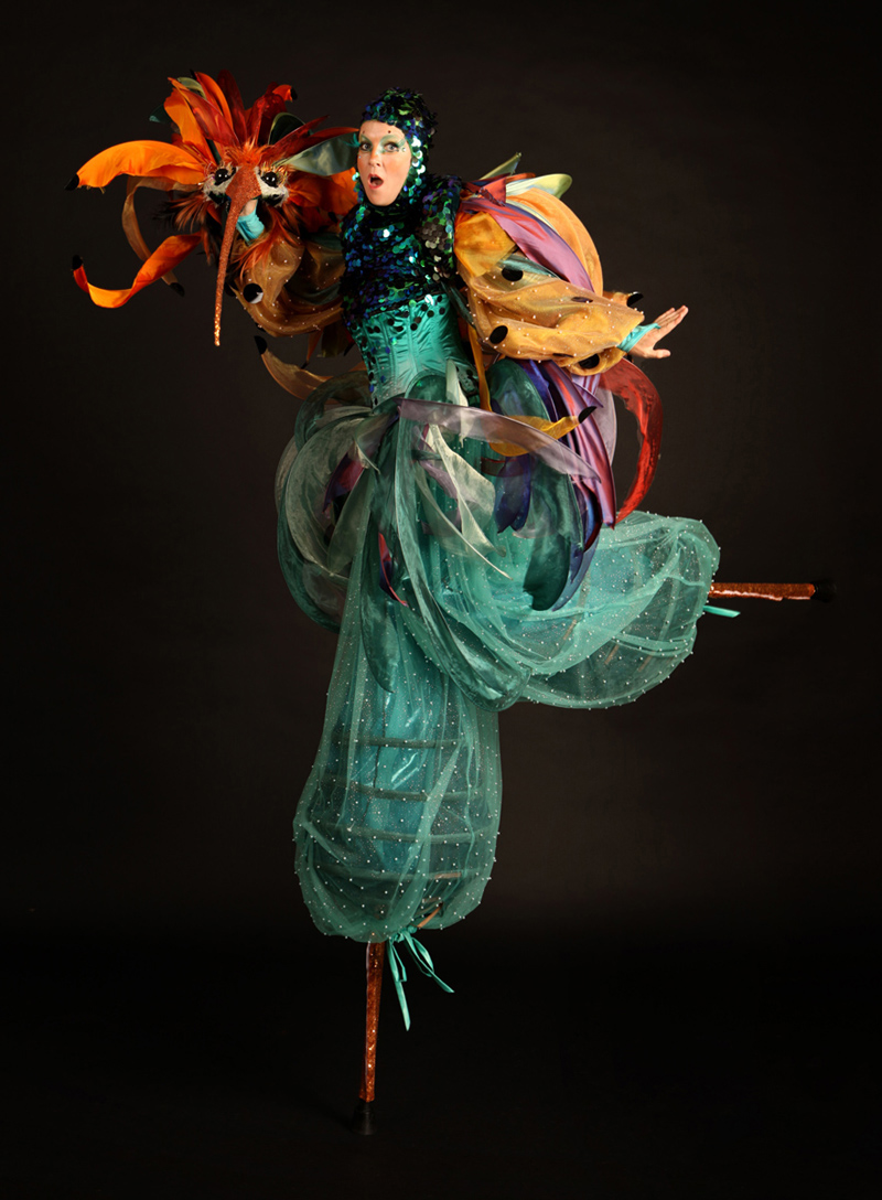 The striking Emerald Hummingbird Stilts evoke the essence of the Rainforest tropical Hummingbirds; with glittering jewel colours and couture costumes this is statement Jungle themed entertainment which creates the wow factor and turns heads